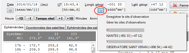 Pour que les éphémérides fonctionnent au mieux, il faut rentrer les coordonnées géographiques de son lieu d’observation. En effet, nos coordonnées terrestres déterminent les heures de lever et de coucher des astres, ainsi que leur altitude dans le ciel. Sur le haut du module d’éphémérides, WinJupos permet évidemment de rentrer à la main ses coordonnées. Mais il permet surtout de les sauvegarder… et d’en sauvegarder plusieurs ! C’est très pratique si vous disposez de plusieurs sites d’observation assez éloignés géographiquement…